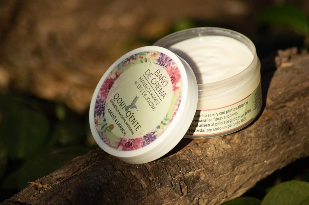 Ingredientes: Agua destilada, Agua madre de Lavanda, Aceite de Jojoba, Manteca de Karité, Varisoft, Glicerina vegetal, Goma Xántica, Alcohol Cetílico, D-Pantenol, Keratina Vegetal, Oleo Resina Ámbar y A. E. de Lavanda, excipientes ECOCERT